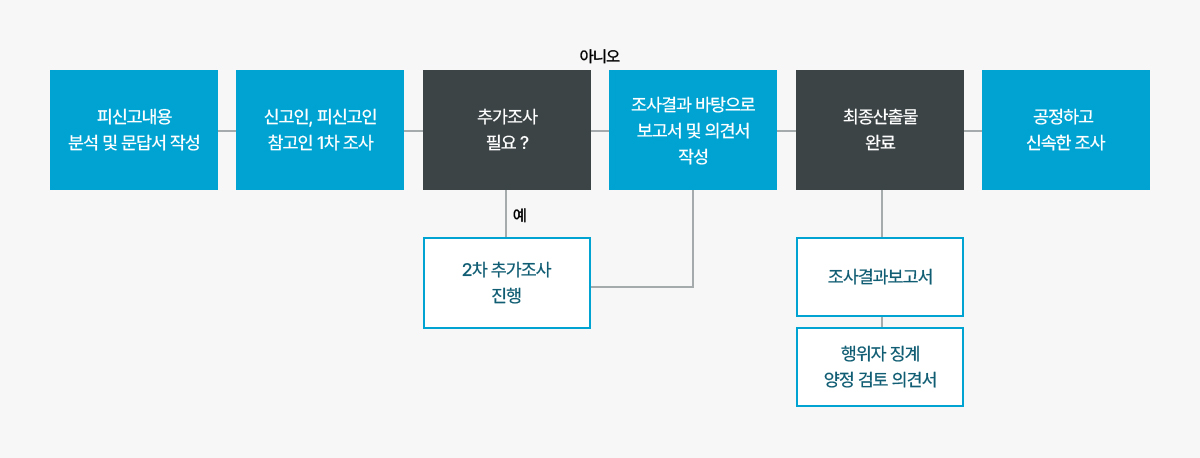 공정한 조사부터 조사 결과 보고 이후 가해자 징계 등 사후조치에 대한 검토까지 원스톱 서비스를 제공합니다.
